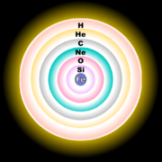 Ještě větší hvězdy mají gravitaci dostatečně silnou k vytvoření teplot a tlaků umožňujících fúzi uhlíku v jádře poté, co se začne smršťovat. Jádra těchto masívních hvězd nabývají vrstevnaté struktury podobné cibuli, jak jsou postupně v centru vytvářena těžší a těžší atomová jádra. Vnější vrstva obsahuje vodíkový plyn, když se noříme dolů, míjíme vrstvu vodíku spojujícího se fúzí v hélium, vrstvu hélia, vrstvu hélia spojujícího se fúzí v uhlík, vrstvu uhlíku a vrstvu uhlíku měnícího se fúzí v těžší prvky. Tyto hvězdy procházejí postupnými stadii vývoje, při přechodu mezi nimi se jádro smršťuje, až začne vytvářet atomová jádra, jejichž fúze byla dříve nemožná, a nově uvolňovaná energie opět nastolí rovnováhu mezi tlakem plynu a gravitací. I v průběhu jednoho stadia se jasnost hvězdy nepravidelně mění — každý nový zážeh fúze vytlačuje prvky z fúzujícího jádra do toho, co nazýváme „hvězdnou obálkou,“ reakce se ztlumí, dovolí gravitaci vmáčknout hmotu zpět do aktivního jádra a začít tak nový cyklus. Limitujícím faktorem v tomto procesu je množství energie uvolněné fúzí, které závisí na vazebné energii v atomových jádrech. Každý následný krok produkuje postupně těžší a těžší prvky, které jsou stále těsněji svázány silnou interakcí, což znamená, že uvolňují při fúzi méně energie, než by uvolňovala lehčí jádra. Nejtěsnější vazby v celém atomovém jádře má železo, chemickým symbolem Fe. Představuje „dno údolí nuklidů,“ lehčí prvky uvolňují energii při fúzi a těžší při štěpení. Když se v jádře hvězdy začne hromadit železný „popel,“ gravitace do aktivní oblasti tlačí více a více hmoty, která postupně projde všemi stupni fúze: vodík na hélium proton-protonovým cyklem, hélium na uhlík tři alfa reakcí, uhlík s héliem na kyslík, kyslík na neon, neon na hořčík, hořčík na křemík a křemík na železo.