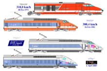 Již 8. prosince 1972 dosáhla jednotka TGV 001 s plynovou turbínou rychlosti 318 km/h, což byl světový rekord vozidel s termickým pohonem. 26. února 1981 dosáhla jednotka TGV PSE č. 16 na trati Paříž - Lyon rychlosti 380 km/h a překonala tak francouzský rekord z roku 1955 - 331 km/h. Hranice 400 km/h byla překonána německou jednotkou ICE 1. května 1988, avšak již 5. prosince 1989 opět převzali štafetu Francouzi - jednotka „TGV-Atlantique“ č. 325 dosáhla rychlosti 482,4 km/h a 18. května 1990 dokonce 515,3 km/h. O možnostech francouzského systému svědčí fakt, že TGV POS č. 4402 drží světový rychlostní rekord pro kolejová vozidla (rychleji jel jen magnetický vlak maglev, 583 km/h, v Japonsku v roce 2005) 574,8 km/h, dosažený 3. dubna 2007 na trati Paříž - Baudrecourt u vesničky Passavant-en-Argonne. Vlak tím vylepšil svůj vlastní nedávný rekord 553 km/h ze dne 13. 2. 2007 a předchozí vytvořený TGV Atlantique č. 325 z 18. 5. 1990, kdy jel na trati Paříž - Tours poblíž Vendôme rychlostí 515,3 km/h. Další pozoruhodný výkon předvedla souprava TGV č. 531 dne 26. května 2001, kdy překonala vzdálenost napříč Francií z Calais do Marseille (1 067,2 km) za 3 hodiny a 29 minut. Na překonání 1 000 km tak potřebovala pouhé 3 hodiny a 9 minut. (Pro srovnání: Eurocity Českých drah trvá v běžném provozu 316 km cesty z Prahy do Břeclavi 3 hodiny a 14 minut.)