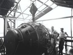 Generál Leslie R. Groves, Robert Oppenheimer u zbytků věže Trinity. |