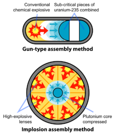 Plutonium získané z reaktoru však nebylo dostatečně čisté jako plutonium získané z cyklotronu a přítomnost dalších isotopů vyústila v nepoužitelnost dosavadního puškového modelu. Tento problém byl vyřešen 17. června 1944[3] a vedl ke změně technologie zbraně na implosní zařízení ve kterém sférické jádro plutonia bude stlačeno pomocí chemických výbušnin, což vedlo k zvýšení hustoty plutonia a vytvoření kritického množství. Sféra plutonia musela být stlačena na všech stranách stejně, chyba by vedla k selhání zbraně. Vzhledem k obtížnosti získání výbušné čočky k dokonalé kompresi výbuchem, velitel projektu generál Leslie Groves a vědecký pracovník Robert Oppenheimer rozhodli, že bude proveden test konceptu zbraně předtím než zbraň bude moci být použita ve válce. Poté co test Trinity prokázal funkčnost modelu, byl design použit v bombě Fat Man svržené 9. srpna 1945 na Nagasaki.