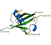 Ubiquitin či ubikvitin je malý globulární protein o délce 76 aminokyselin, přítomný ve všech eukaryotických buňkách, který reguluje rozklad jiných proteinů v proteazomu, lyzozomu či ve vakuole. V určitých případech však také stimuluje endocytózu, vnitrobuněčný transport a podílí se na udržování struktury chromatinu (ubiquitin se váže se na histony).[1] Ubiquitin se zpravidla připojí na protein, který má být rozložen (degradován), tento proces navázání ubiquitinu se označuje jako ubiquitinace. Váže se glycinem (na svém C-terminálním konci) k lysinu na proteinu určenému k degradaci.[1] Po připojení ubiquitinu je označený protein degradován proteasomem 26S. Tato degradace je specifická a přesně cílená, je tedy často využívaná pro specifické odstranění proteinů signálních drah. Proteiny degradované proto, aby jejich aminokyseliny, případně peptidy mohly být použity jako stavební kameny, bývají degradovány spíše nespecificky proteázami.
