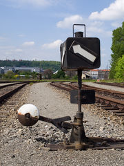 Výměník pro ruční obsluhu s návěstidlem. V základní poloze je bílá polovina závaží nahoře.