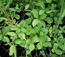 Dolní části lodyh jsou vystoupavé, nesou vždy několik listů. Listy jsou pochvaté dlouze řapíkaté, tříčetné, s lístky téměř přisedlými nebo podlouhle obvejčitými, 4 - 8 (- 12) cm dlouhé a 1,7 - 3,0 (- 5,5) cm široké.Lístky jsou tupé, celokrajné až mělce chobotnatě vroubkované, s vyniklou zpeřenou žilnatinou. Pochva je 3 - 5 cm dlouhá, řapík až 20 (25) cm dlouhý, plný, s aerenchymatickým pletivem a nápadnými cévními svazky.[L 1]
