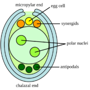 Vajíčka semenných rostlin se vyvíjejí z dělivého pletiva placenty. V živném pletivu vajíčka (nucelu) vzniká poblíž otvoru klového jedna větší diploidní buňka – mateřská buňka zárodečného vaku. Ta se obvykle různými způsoby dělí, aby na konci vznikl zralý zárodečný vak, připravený k oplození. U sedmdesáti procent zkoumaných rostlin probíhá tzv. normální nebo také rdesnový typ vývoje zárodečného vaku.[1] Mateřská buňka zárodečného vaku se redukčně dělí a ze čtyř takto vzniklých haploidních buněk přežívá jediná – mladý zárodečný vak. Jeho jádro se třikrát dělí a vznikne osmijaderný zralý zárodečný vak. V něm se vytvoří šest malých haploidních jednojaderných buněk a jedna velká dvoujaderná centrální buňka zralého zárodečného vaku. Později obě její jádra splývají v jedno jádro diploidní. Haploidní buňky jsou ve finále uspořádány po třech u opačných pólů zárodečného vaku. Dva buňky sousedící s vaječnou buňkou nazýváme buňky podpůrné (synergidy), napomáhají oplození a fungují jen po určitou dobu. Nejdůležitější z nich je však vaječná buňka poblíž otvoru klového. Tři buňky protistojné (antipody) jsou na opačném pólu zárodečného vaku, někdy zanikají brzy, někdy se dlouhodobě dělí. Pravděpodobně ovlivňují výživu vajíčka.