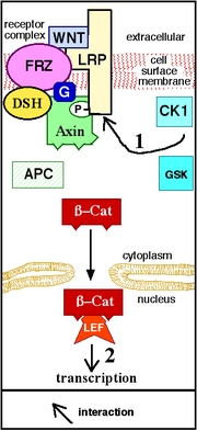 Wnt signalizace (Wnt se čte jako „wint“ a je to zkratka z Wingless/Int-1[1]) je důležitá signalizační kaskáda, která zahrnuje několik typických klíčových komponentů. Na vnější straně membrány se na receptor Frizzled (spřažený s G-proteinem) naváže signální glykoprotein z Wnt rodiny (např. Wnt1, Wnt2). Na vnitřní straně membrány je tímto receptorem aktivován nějaký prostředník (např. Dishevelled), který následně inhibuje komplex tří proteinů GSK3/axin/APC. Když jsou tyto proteiny inhibovány, β-katenin jimi přestane být fosforylován a začne se akumulovat v cytoplazmě v nefosforylované formě. Následně β-katenin vstupuje do jádra a po kombinaci s transkripčními faktory z TCF/LEF rodiny ovlivňuje transkripci genů.[2] Význam Wnt signalizační kaskády spočívá v její roli v embryonálním vývoji. Řídí vytváření vzorů a reguluje buněčnou proliferaci v různých místech těla.[1] Podílí se na takových základních procesech, jako je gastrulace, embryonální vývoj mozku a vývoj končetin i jiných orgánů.[2]
