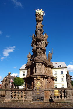 - Morový Sloup Nejsvětější Trojice na náměstí Svobody zbudovaný roku 1708[2], roku 2007 zrenovován s vydatnou finanční pomocí z Německa. Obsahuje mj. 20 soch. Výška sloupu je 20 metrů.