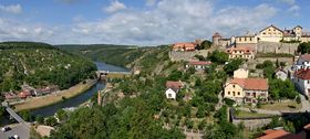 Pohled ze Znojemského hradu na starou část města Znojmo s kostelem svatého Mikuláše a kaplí svatého Václava v popředí.