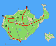Vojenské objekty na Aegně: 1., 2. a 3. baterie (1b, 2b, 3b) a pracovní pozice jejich světlometů (1s, 2s, 3s), původní pozice 2. a 3. baterie (2a, 3a), protivýsadkové pozice (4, 5), výjezdní protivýsadková pozice (6), protiletadlová baterie (7), nová protiletadlová baterie z r. 1940 (8), baterie z r. 1942 (9), vojenské centrum (C), hlavní velitelské stanoviště (H) a důstojnické kasino (D). Červeně je vyznačena trasa úzkorozchodné železnice, oranžově záhy rozebraný úsek trasy k původnímu přístavnímu molu.