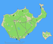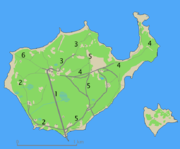 Místa spjatá se staršími dějinami ostrova: 1 - obětní kámen, 2 - zbytky kamenného labyrintu, 3 - umístění vesnice, 4 - vesnický hřbitov