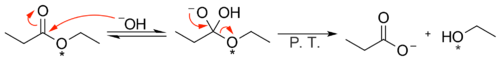 | - | [[ | + | [[File:Nucleophilic Acyl Substitution with a Labeled Oxygen.png|center|thumb|500px|Bazická hydrolýza esteru]] |
