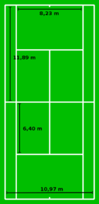 • Tenisový kurt je dlouhý 23,77 m a široký 8,23 m. Kurt je uprostřed rozdělen sítí zavěšenou ve výšce 0,914 m (měřeno uprostřed), na okraji kurtu má síť výšku 1,07 m.