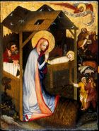 V českém i evropském gotickém umění byly Vánoční události zpravidla zobrazovány jako součást christologických cyklů. Příkladem je například Vyšebrodský cyklus od Mistra vyšebrodského oltáře. Narození Krista v tomto cyklu obsahuje množství vedlejších ikonografických motivů, což je pro gotické umění obvyklé. Marie zde mj. líbá malého Ježíše jako poukaz na paradoxní situaci, že ji katolická teologie chápe nejen jako Kristovu matku, ale i jako symbol církve tj. nevěstu Kristovu. V popředí výjevu je zobrazen donátor a také nezvyklý apokryfní motiv lázně.