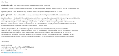 - E-mail by měl obsahovat – základní popis Vaší firmy, IČO, platné telefonní číslo, vybraný typ prezentace (třeba: Holding – LITE) a všechny vaše preferované kategorie.