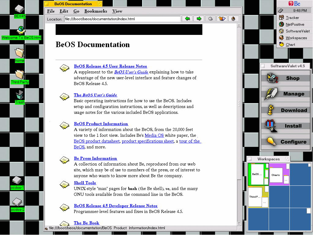 Snímek obrazovky + systému BeOS verze 4.5 se systémovou anglickou nápovědou ve formátu HTML