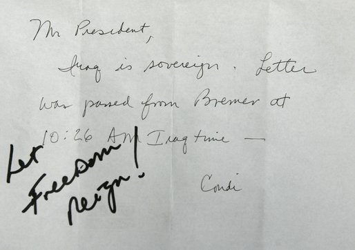- U.S. President George W. Bush received this note from his national security adviser, Condoleezza Rice, at the NATO Summit in Istanbul, June 28 2004, notifying him that the sovereignty in Iraq had been handed over from the U.S. administration to the Iraqi provisional government. "Let freedom reign" he wrote on it.
