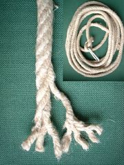 Konopné lano s průměrem 10 mm (snímek vpravo nahoře) by mělo snést nejméně 700 kg zatížení. Je spleteno ze čtyř šnůr, každá z nich sestává ze 4 tlustých nití. Přístroje s ručním pohonem, podobné exempláři z roku 1928 na snímku vpravo, se používaly ke splétání lan asi do poloviny minulého století. Před tímto zařízením chodil po dvaceti- až třicetimetrové „lanové dráze“ další pracovník s úkolem odtahovat hotový konec lana. Dnešní splétací stroj pracuje automaticky na ploše cca 4 m².[4] Oplétání lanového jádra se provádí na speciálních strojích (vyráběných například i v Novém Jičíně)[5], které splétají niťové prameny nebo pásky kolem svazku vláken s vysokou pevností.